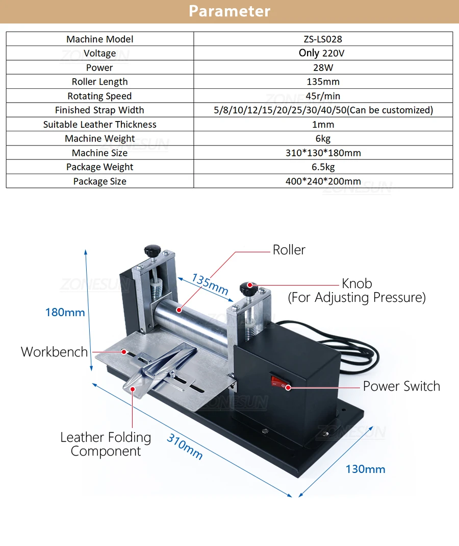 Предназначен для накатки кожаного ремня сумки, подходит для кожаных сумок ручной работы. Он маленький и простой в эксплуатации, безопасная работа, длительный срок службы и низкий уровень шума. Это идеальный выбор для кожзаменителя.