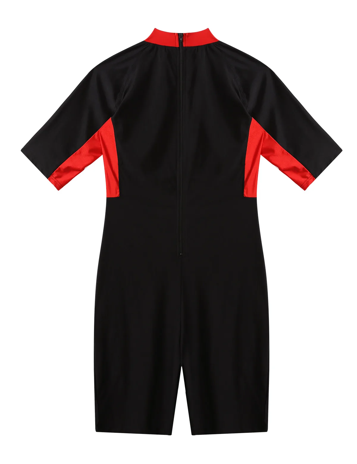 Круглый вырез и полурукава, короткий стиль и цветной дизайн, плотно прилегает и закрывает тело от шеи до колена, застежка-молния сзади.