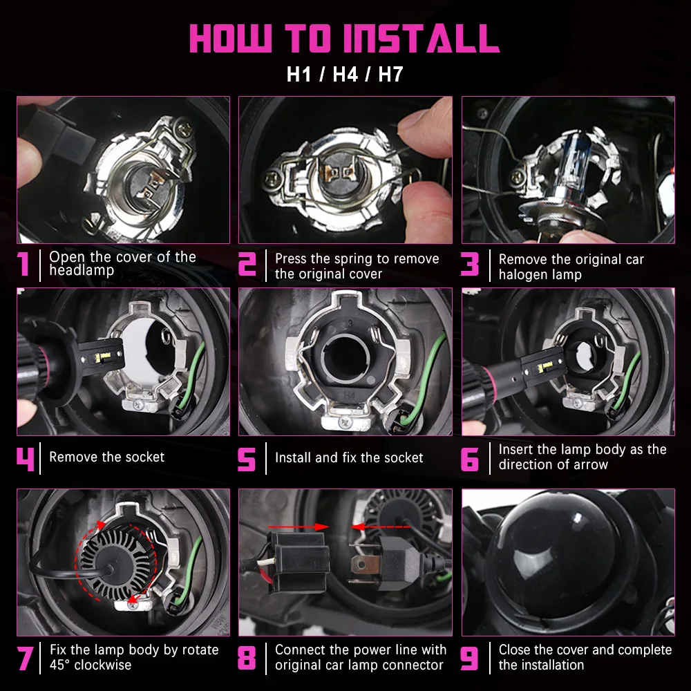 1. Пожалуйста, проверьте светодиодный светильник базового типа и размера вашего автомобиля, чтобы подтвердить, подойдет ли товар.2. В качестве предосторожности убедитесь, что у автомобиля было время, чтобы остыть должным образом, прежде чем начать процесс установки.3. Убедитесь, что зажигание выключено и ключи удалены.4. Полностью проверьте соединение контактных точек, портов и проводов, так как неисправные соединения могут вызвать проблемы с освещением.5. Если система проводки canbus показывает признаки проблем, предупреждающие об ошибке на приборной панели: Сбой ламп, мерцание, клиентам может потребоваться один предупреждающий/отклоняющий резистор нагрузки/декодер для обхода сообщения об ошибке.Как установить H1/H4/H7