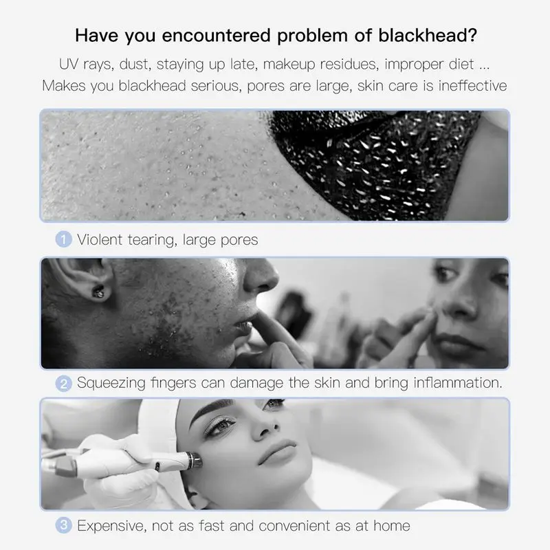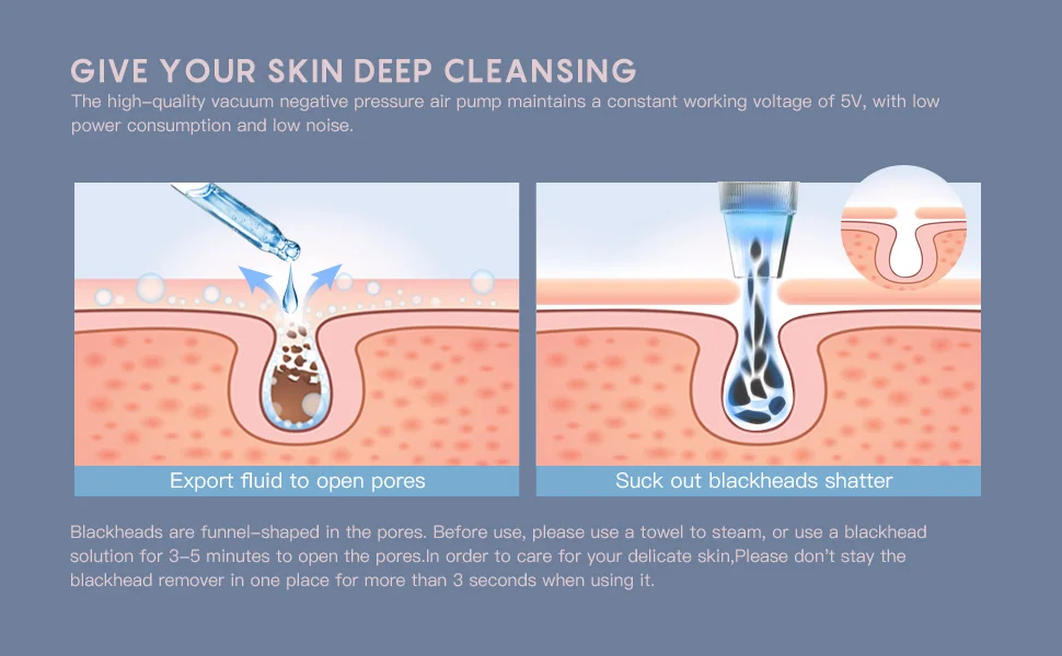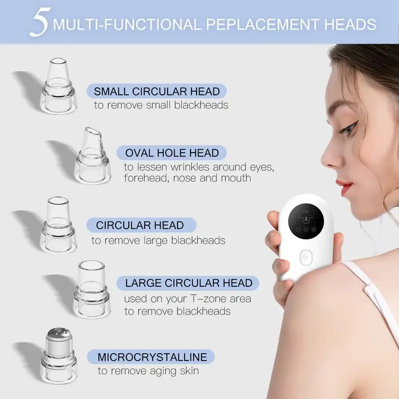【Дизайн для всех проблем для лица 】5 сменных головок зонда и 3 регулируемых режима всасывания для всех ваших проблем с лицом. Уровень 1 предназначен для жирной кожи, уровень 2-для нейтральной и смешанной кожи, уровень 3-для чувствительной и сухой кожи. 5 всасывающих головок используется для различных условий кожи, таких как уменьшение омертвевшей кожи и тонких линий, удаление черных точек и затягивание кожи.